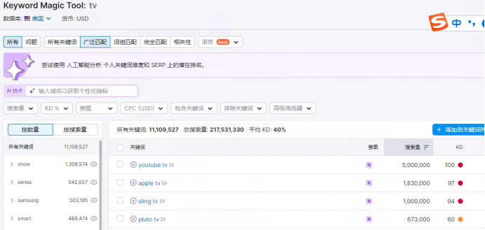 关键词需求可以使用semrush的:Keyword Magic Tool,例如:tv在美国的长尾关键词搜索量和对应关键词的难度。