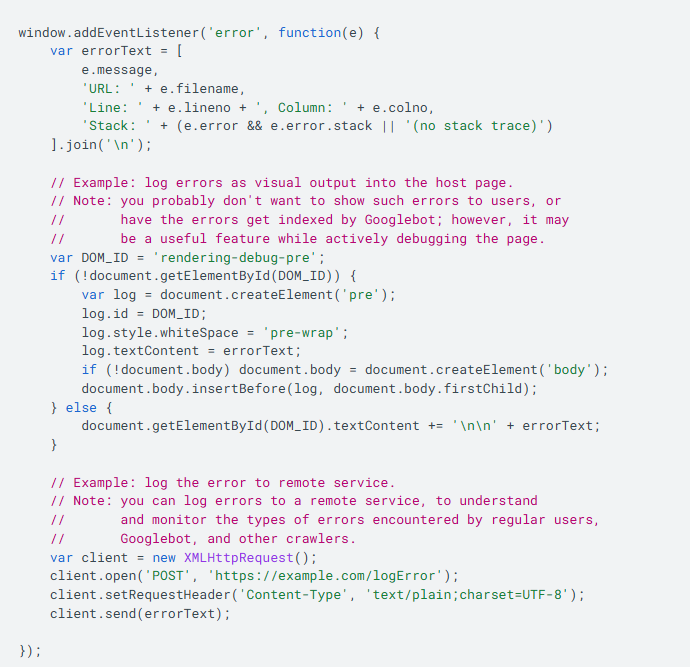 此外,我们还建议您收集和审核用户(包括 Googlebot)在您网站上遇到的 JavaScript 错误,确定可能会影响内容呈现效果的潜在问题。