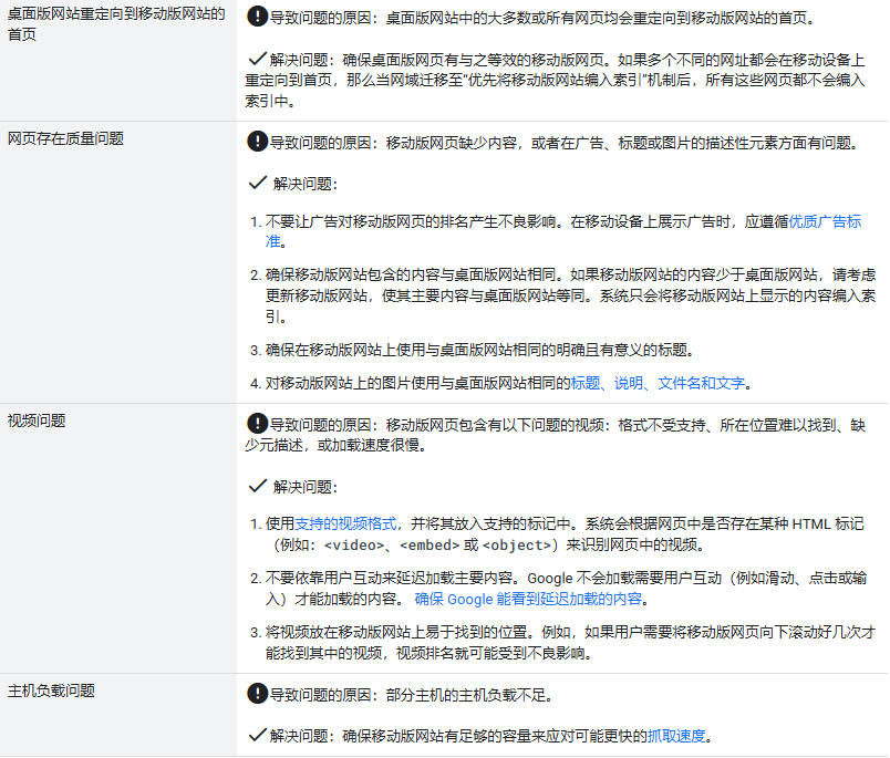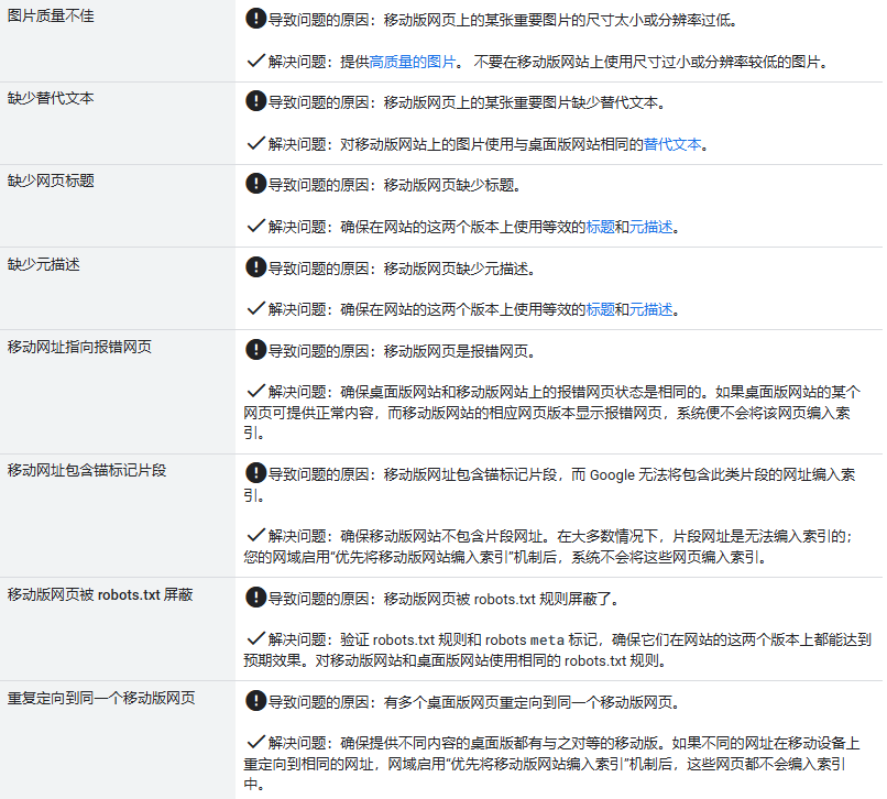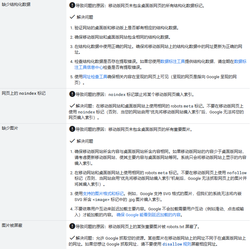下面列出了各种最常见的错误,这些错误可能会导致无法为网站启用“优先将移动版网站编入索引”机制,也可能会导致网站在启用“优先将移动版网站编入索引”机制后出现排名下降。如果您的网站尚未启用“优先将移动版网站编入索引”机制、您在网站启用“优先将移动版网站编入索引”机制后发现排名下降,或者您在 Search Console 中收到了相关消息,请查看常见错误列表并解决可能存在的错误: