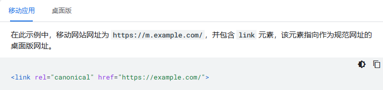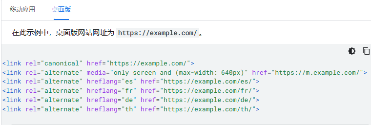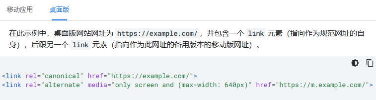 (8)在移动版和桌面版之间使用正确的 rel=canonical 和 rel=alternate link 元素。桌面版网址始终是规范网址,而移动版网址则是该网址的备用网址。