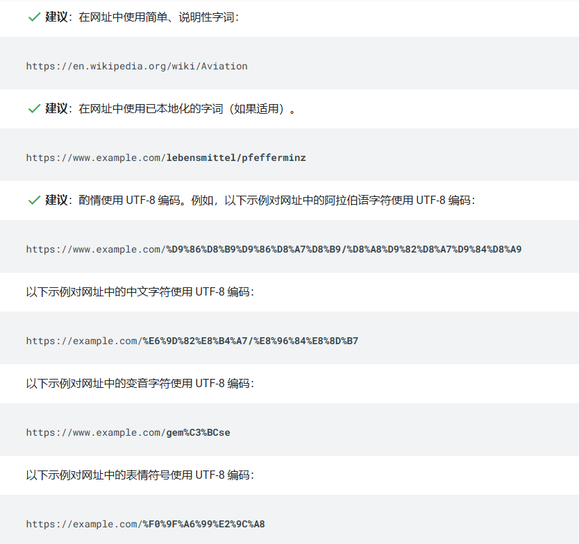 Google 支持 RFC 3986 中定义的网址。所有被这项标准定义为预留的字符都必须采用百分比编码。非预留 ASCII 字符可以保留未编码形式。此外,非 ASCII 范围内的字符应采用 UTF-8 编码。