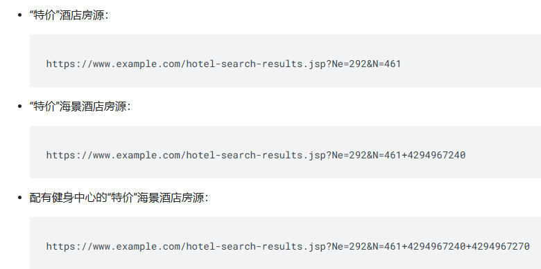 (1)累加过滤一组项目。很多网站都会针对同一组项目或搜索结果提供不同的视图,通常让用户能够使用指定的条件(例如:显示海景酒店)过滤出该组。当过滤条件可按累加模式组合时(例如:海景酒店,且配有健身中心),网站中网址(数据视图)的数量就会急剧增加。由于 Googlebot 只需查看少量列表就能访问各个酒店的网页,所以没必要创建大量只有细微差异的酒店列表。例如:
